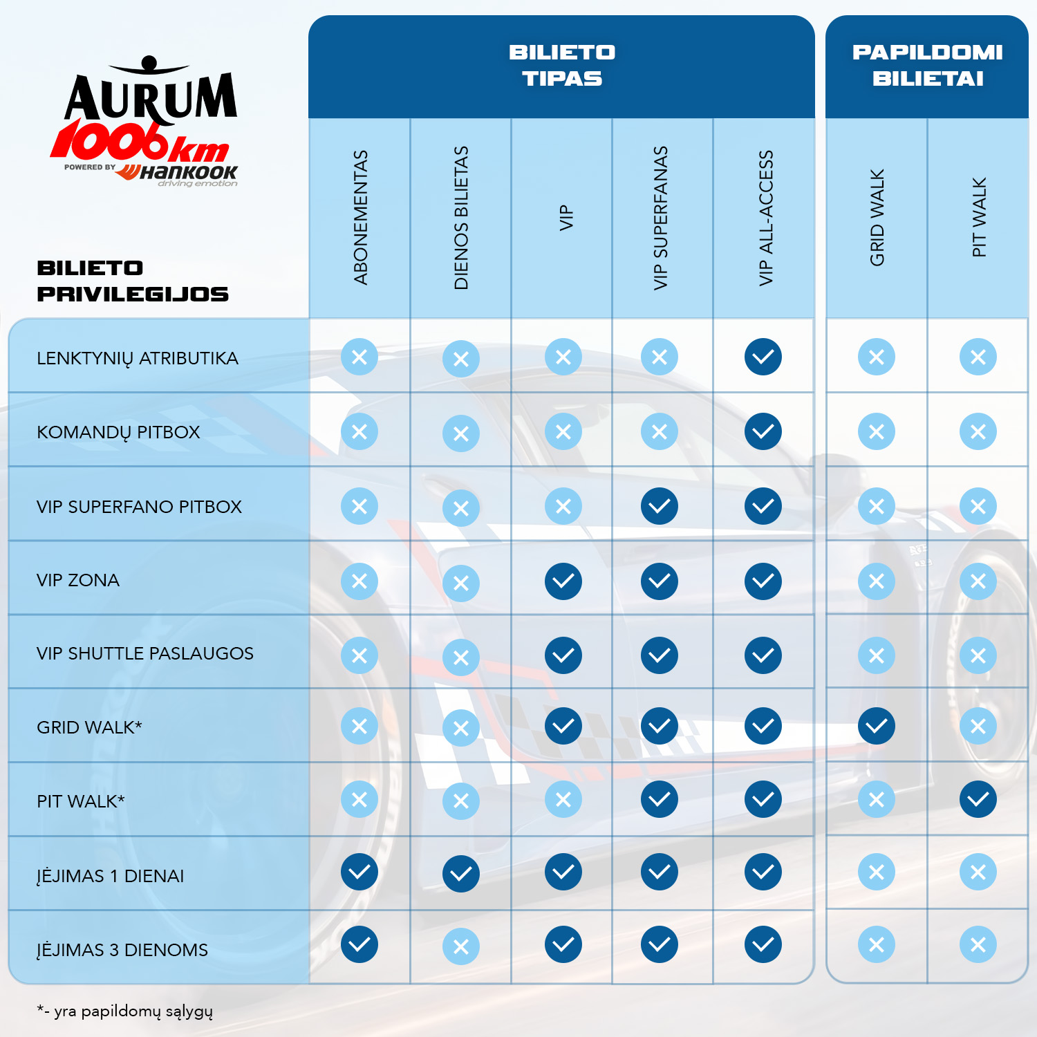 *GRID WALK ir PIT WALK yra papildomi bilietai, galiojantys tik turint patekimo į renginį bilietą.